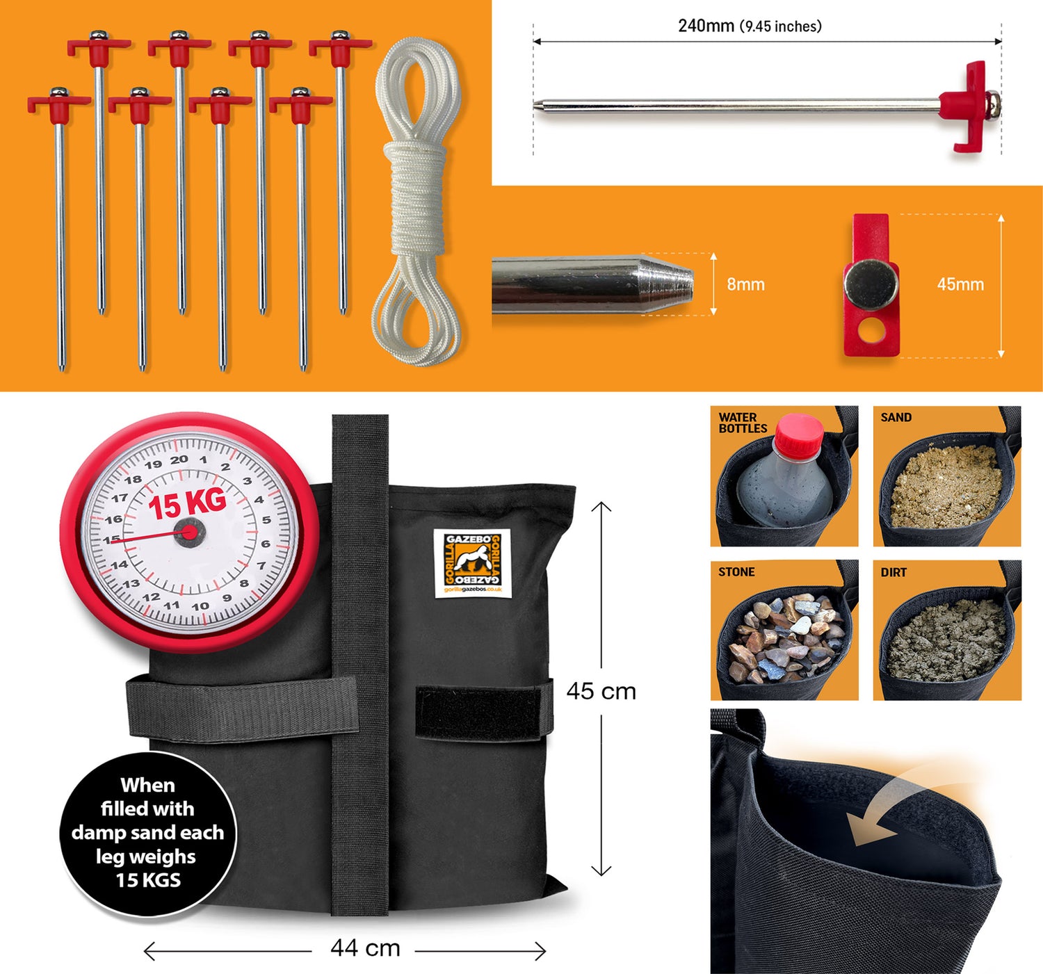 For added stability in all conditions, each gazebo comes with four durable leg weight bags. These can be easily filled with a variety of materials – such as sand, stones, or even water bottles – providing essential ground anchoring to keep your structure secure and steady, whether you're on grass, concrete, or hardstanding.